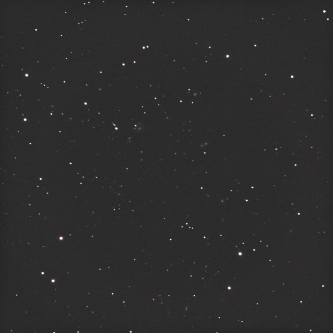 Abell 2657は,差し渡し30分の範囲に50個あまりの微小な銀河を含みます。最も明るい銀河は中央やや左上に見られる楕円銀河のCGCG407-53ですが,視直径は1分以下,明るさは15等級です。 距離は4億4000万光年と推定されています。 | |