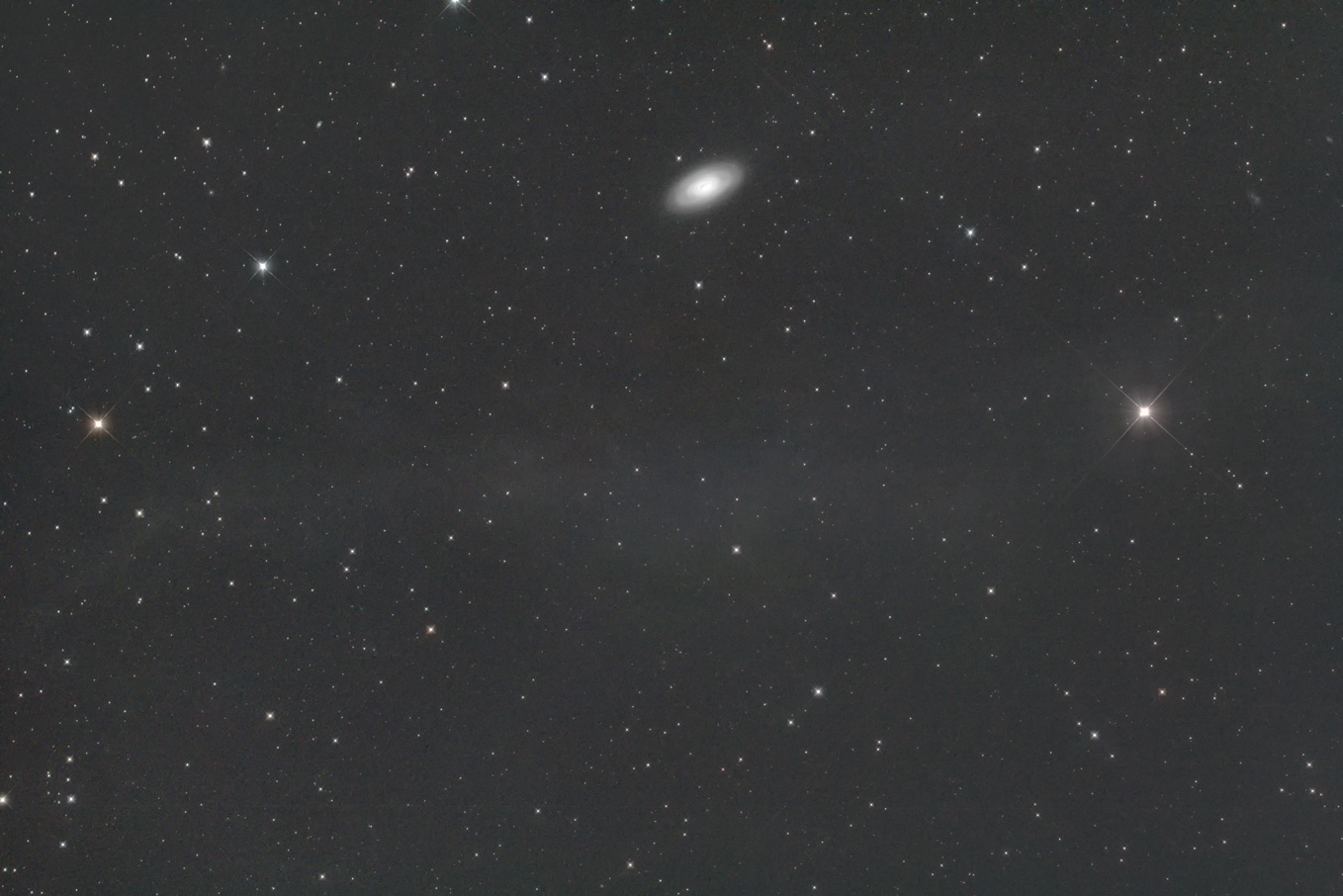 M64の見かけの大きさは10分×5分ほどあり,双眼鏡でも星雲状に見えます。小望遠鏡で認めるのは難しいものの,星雲の中心部に非常に発達した暗黒帯が見られるのが最大の特徴です。