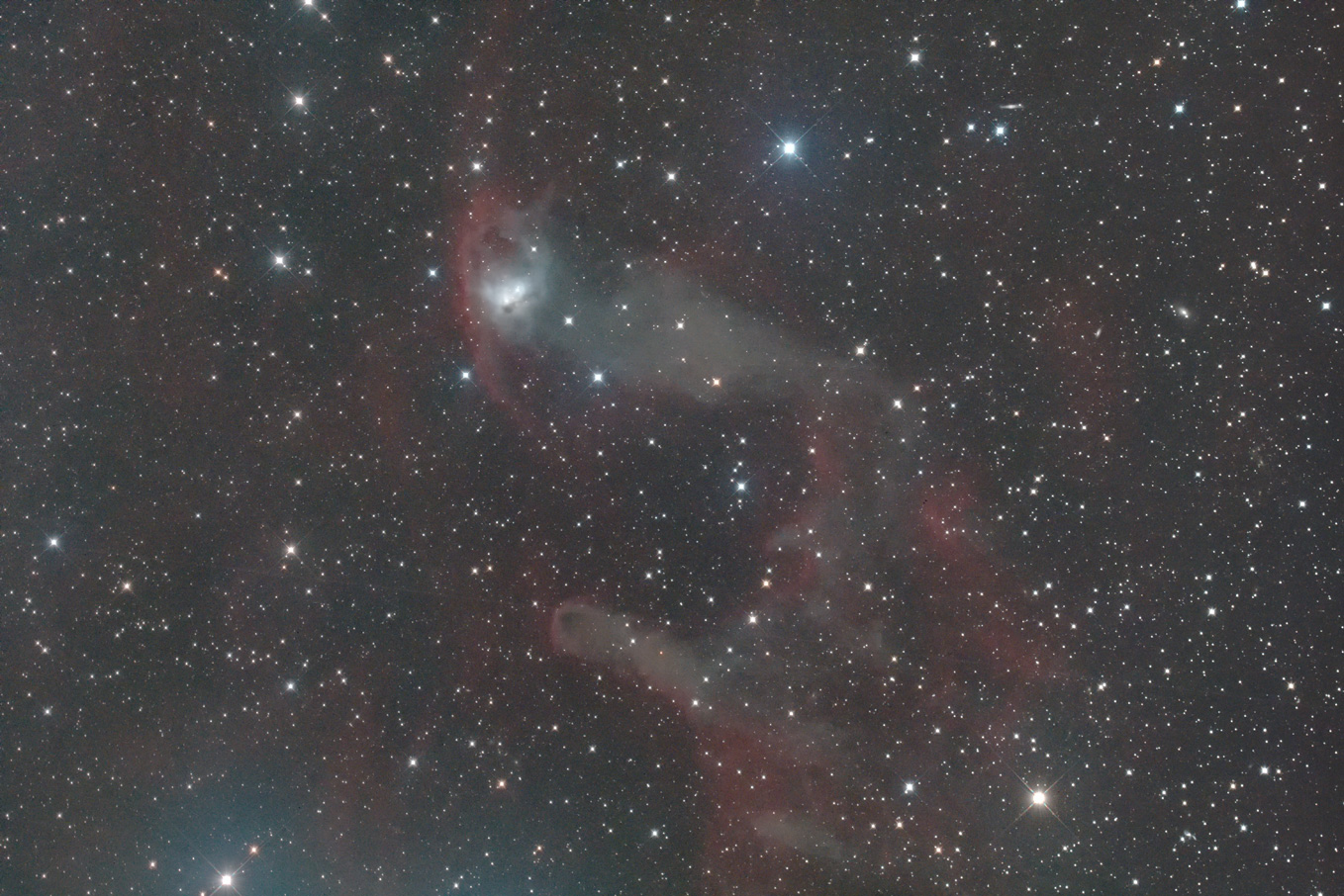 At the center of the nebula is a rather intricate structure where the dark nebula LDN 1616 is interwoven.