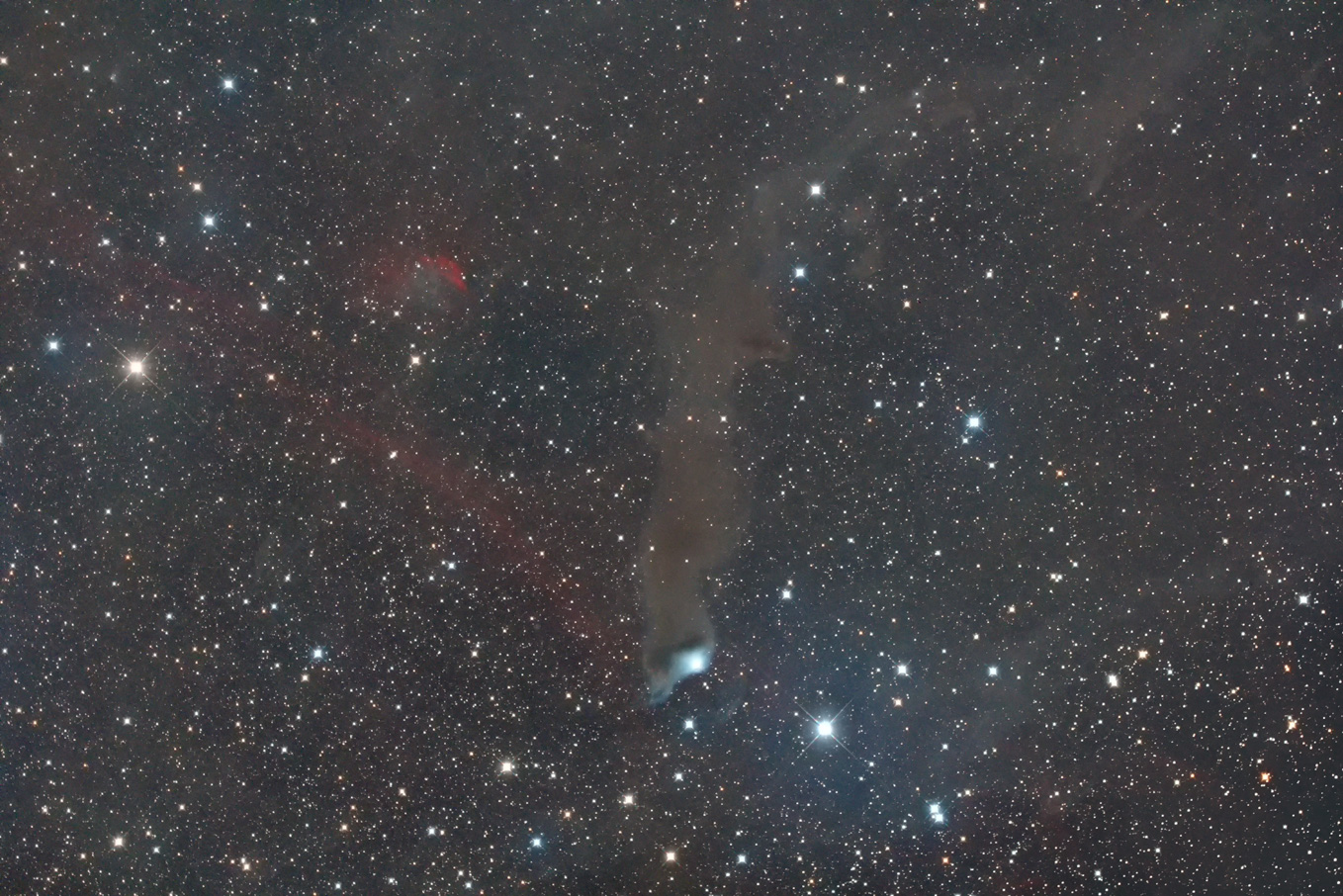 The bluish reflection nebula visible toward the bottom of the frame is vdB 152, where the southern edge of the molecular cloud reflects the light of a 9th-magnitude blue star.