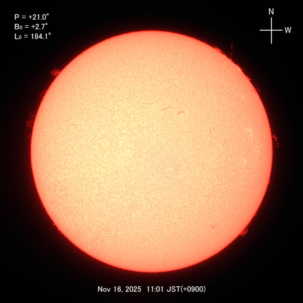 ここでは2007年4月から始めた,コロナド製の口径40mm Hα線太陽専用望遠鏡による撮影画像を公開しています。 Hα線(656.3nm)による太陽観測では,彩層面のプラージュ(活動領域),フレア,彩層網,ダークフィラメント,また外縁部のプロミネンスなどの興味深い現象を連続観測することができます。 ここで扱う画像は観測結果としての性格が強いため,個々の画像の詳しい解説は極力省き,画像アーカイブの構築を目標としています。 | ||||||||